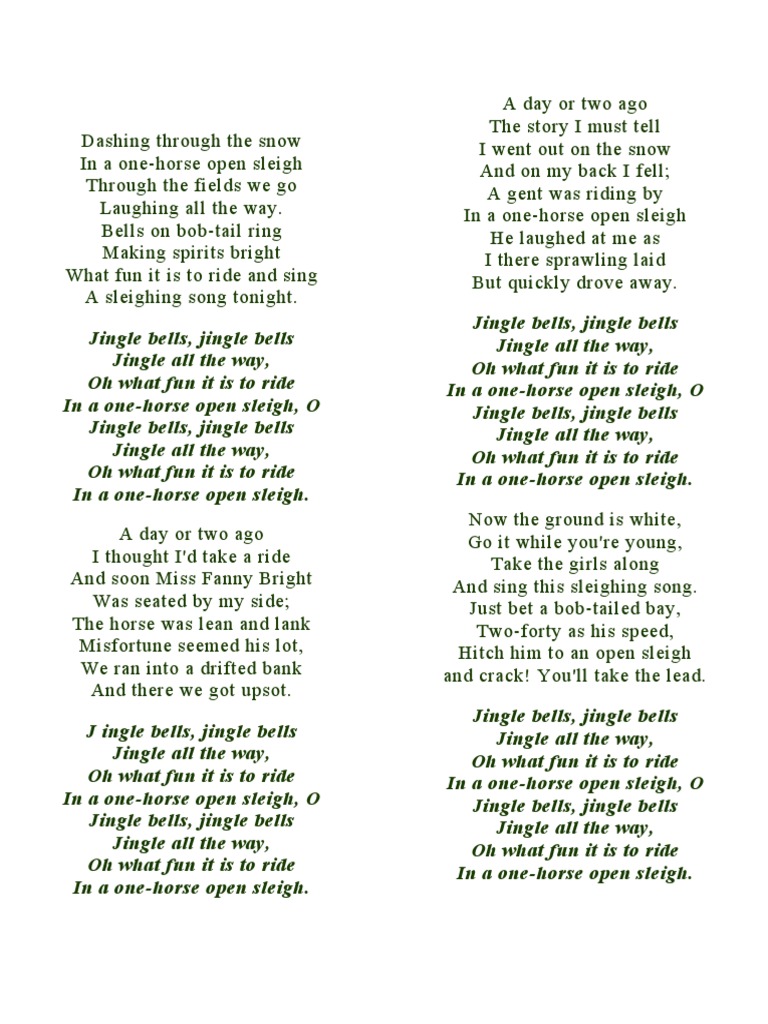 Dashing through the snow g g g e d c a on a one horse open sleigh a f e d b o'er the fields we go, g g f d e laughing all the way g e d c g bells on bob tail ring, g e d c a making spirits bright a a f e d g g g what fun it is to laugh and sing g a g f d c g a sleighing song tonight, oh. Jingle bells, jingle bells, jingle all the way; Jingle bells, jingle bells, jingle all the way; Bells on bobtail ring, making spirits bright. Unlimited copies for you and your students.
